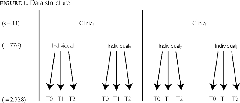 First-stage data analyses were done using SPSS 12 (SPSS 2003). Because of the hierarchical nature of the data (Figure 1), a tri-level model was constructed for each self-efficacy outcome (general and mental) to examine key relationships with repeated measures (T0, T1 or T2) at level one, individual characteristics at level two and organizational factors at level three. All multilevel analyses were conducted using HLM 6 (Raudenbush et al. 2004). Variance components were first examined in an intercept-only model to determine the amount of total variation in the outcome that is attributable to each level of predictors. Next, in a random intercept model, selected predictors were entered in sequence. To keep models parsimonious, only covariates that were judged conceptually or clinically important were chosen from those that appeared as significant correlates of self-efficacy in earlier bivariate analyses. Continuous predictors were centred on their mean. Final models included a random slope (allowed to vary across patients) and a cross-level interaction between slopes and self-rated health (i.e., slopes allowed to vary differently across levels of self-rated health). All models controlled for age, sex and inclusion diagnosis.