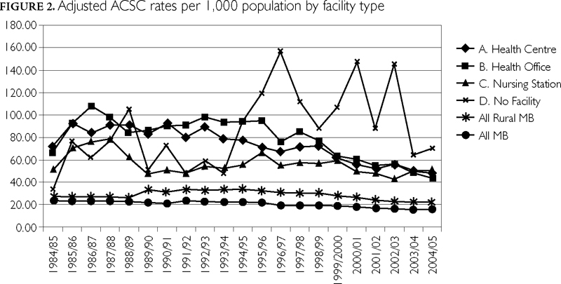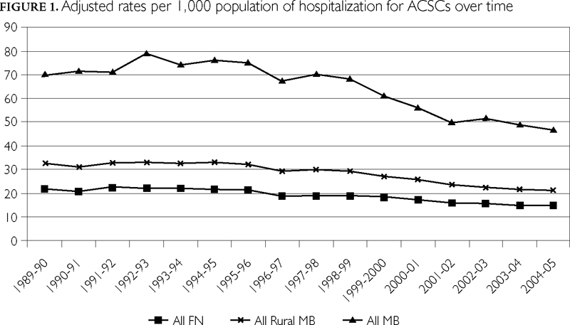 Hospitalizations for ACSC diagnoses may therefore indicate a potentially preventable complication resulting from limited access to responsive primary healthcare services. Further, a disproportionate rate of hospitalization for ACSCs among First Nations people, when compared to other Manitobans, suggests possible inequity in access to primary healthcare (Martens et al. 2005) and the need for investment. This indicator has been endorsed by researchers and policy makers as a dependable indicator of the performance of primary healthcare services (CIHI 2006, 2007; Marshall et al. 2004).
