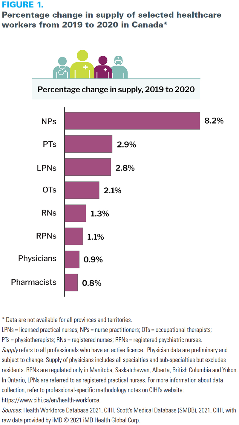 From 2019 to 2020, Canada saw an increase in the supply of selected healthcare workers, including physicians (0.9%), regulated nursing professionals (1.8%), pharmacists (0.8%), physiotherapists (2.9%) and occupational therapists (2.1%) (Figure 1). More than 90% of these healthcare workers (excluding physicians) were working in a role related to their profession. Of those, about 9 out of 10 worked in direct patient care roles.