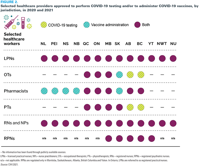 Each jurisdiction looked to different professions to meet these demands. For example, Quebec authorized midwives, chiropractors, occupational therapists, optometrists, ambulance technicians and those practising within a health and social services institution to perform COVID-19 testing. Across the country, many provinces and territories also expanded the list of healthcare workers approved to administer COVID-19 vaccines to accelerate the process in order to protect Canadians. Figure 2 provides a snapshot of publicly available data captured in CIHI's COVID-19 Intervention Scan (CIHI 2022), showing different types of healthcare workers approved to administer COVID-19 tests or vaccinations across Canada.