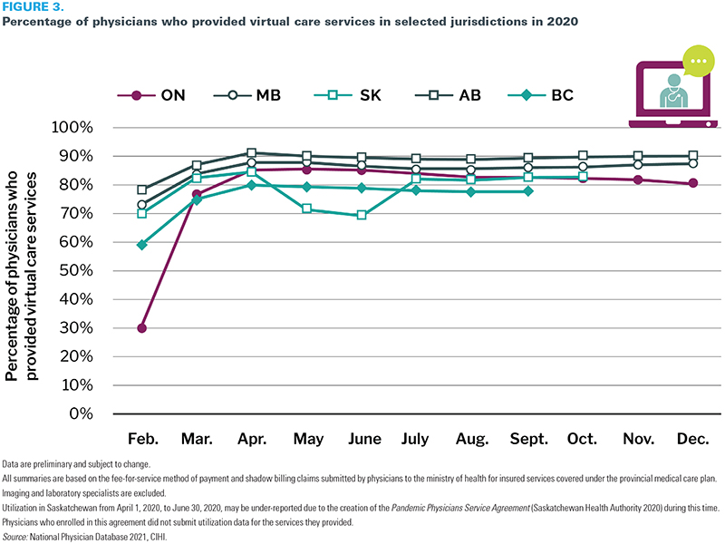 In February 2020, for the provinces where data were available, 48% of physicians had provided at least one virtual care service. By April 2020, this had increased to 85.3% (Figure 3).
