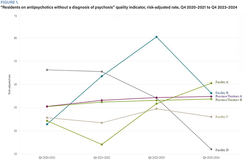 For example, in Figure 1 we can deduce that province/territory A had an overall higher risk-adjusted rate for “residents on antipsychotics without a diagnosis of psychosis” quality indicator than province/territory B, and that in Q4 2022–2023, facility B had a higher risk-adjusted rate than any other facility chosen for comparison. (CIHI. IRRS Long Term Care Secure Reporting. Accessed May 23, 2025.)