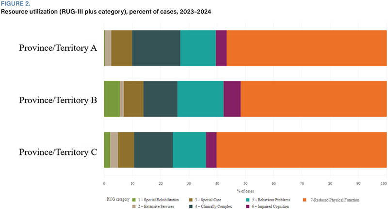 Figure 2 shows an example of a horizontally stacked bar graph showing resource utilization (RUG-III plus category) for multiple provinces/territories. In this figure, Province/Territory B has a higher percentage of special rehabilitation cases – information that can be used for capacity planning. When a user is in the IRRS secure reporting platform, they can hover over each section in the graph to show specific statistics (e.g., specific percentage of reduced physical function cases). (CIHI. IRRS Long Term Care Secure Reporting. Accessed May 23, 2025.)